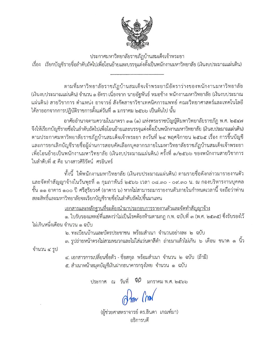 เรียกบัญชีรายชื่อลำดับถัดไปเพื่อโอนย้ายและบรรจุแต่งตั้งเป็นพนักงานมหาวิทยาลัย สายวิชาการ (เงินงบประมาณแผ่นดิน)
