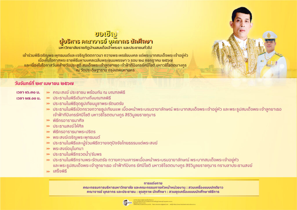 ขอเชิญ ผู้บริหาร คณาจารย์ บุคลากร นักศึกษา มหาวิทยาลัยราชภัฏบ้านสมเด็จเจ้าพระยา และประชาชนทั่วไป เข้าร่วมพิธีเจริญพระพุทธมนต์และเจริญจิตตภาวนา ถวายพระพรชัยมงคล แด่พระบาทสมเด็จพระเจ้าอยู่หัว เนื่องในโอกาสพระราชพิธีมหามงคลเฉลิมพระชนมพรรษา ๖ รอบ ๒๘ กรกฎาคม ๒๕๖๗ และเนื่องในโอกาสวันคล้ายวันประสูติ สมเด็จพระเจ้าลูกยาเธอ เจ้าฟ้าทีปังกรรัศมีโชติ มหาวชิโรตตมางกูร ณ วัดประดิษฐาราม กรุงเทพมหานคร