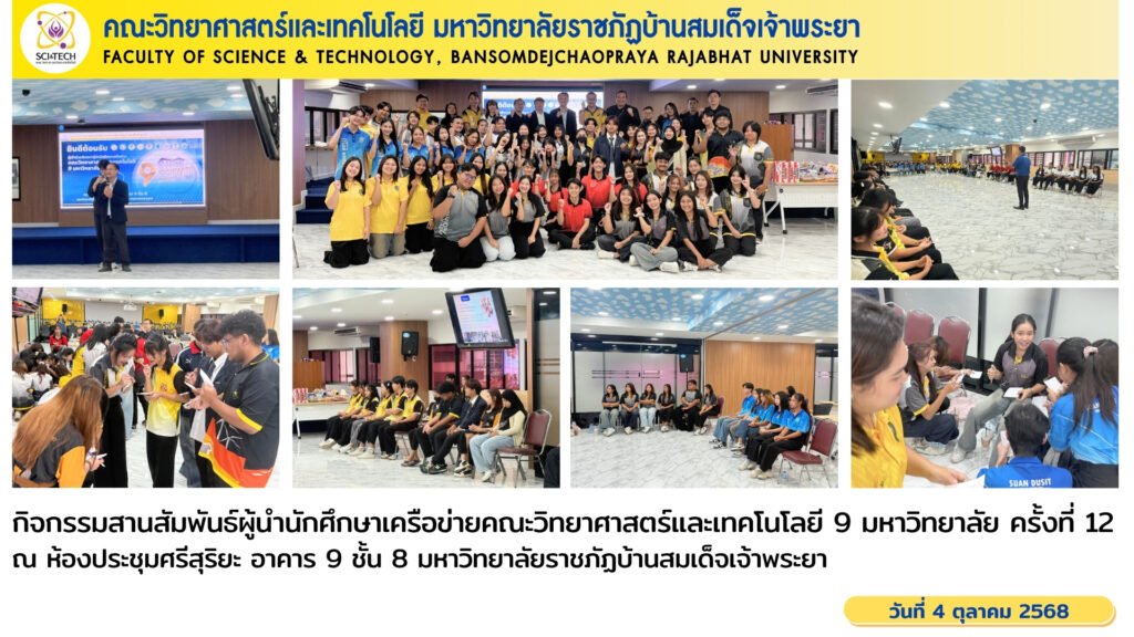 คณะวิทยาศาสตร์และเทคโนโลยี มหาวิทยาลัยราชภัฏบ้านสมเด็จเจ้าพระยา จัดกิจกรรมสานสัมพันธ์ผู้นำนักศึกษาเครือข่ายคณะวิทยาศาสตร์และเทคโนโลยี 9 มหาวิทยาลัย ครั้งที่ 12 ณ ห้องประชุมศรีสุริยะ อาคาร 9 ชั้น 8 มหาวิทยาลัยราชภัฏบ้านสมเด็จเจ้าพระยา