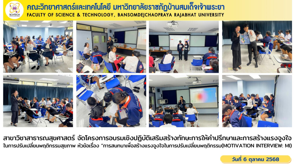 สาขาวิชาสาธารณสุขศาสตร์ คณะวิทยาศาสตร์และเทคโนโลยี มหาวิทยาลัยราชภัฏบ้านสมเด็จเจ้าพระยา จัดโครงการอบรมเชิงปฏิบัติเสริมสร้างทักษะการให้คำปรึกษาและการสร้างแรงจูงใจในการปรับเปลี่ยนพฤติกรรมสุขภาพ ให้กับนักศึกษาหลักสูตรสาธารณสุขศาสตรบัณฑิต ชั้นปีที่ 2 ในหัวข้อเรื่อง “การสนทนาเพื่อสร้างแรงจูงใจในการปรับเปลี่ยนพฤติกรรม (MOTIVATION INTERVIEW: MI)” โดยวิทยากร นางสาววิภาดา รูปงาม พยาบาลวิชาชีพชำนาญการ กลุ่มงานเวชศาสตร์วิถีชีวิต สถาบันพัฒนาสุขภาวะเขตเมือง