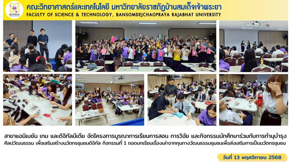 สาขาแอนิเมชัน เกม และดิจิทัลมีเดีย คณะวิทยาศาสตร์และเทคโนโลยี มหาวิทยาลัยราชภัฏบ้านสมเด็จเจ้าพระยา จัดโครงการบูรณาการเรียนการสอน การวิจัย และกิจกรรมนักศึกษาร่วมกับการทำนุบำรุงศิลปวัฒนธรรม เพื่อเสริมสร้างนวัตกรชุมชนดิจิทัล กิจกรรมที่ 1 ถอดบทเรียนเรื่องเล่าจากทุนทางวัฒนธรรมชุมชนเพื่อส่งเสริมการเป็นนวัตกรชุมชน