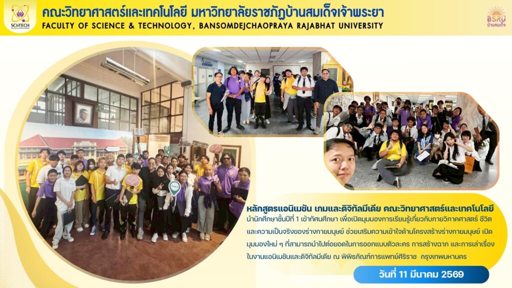 หลักสูตรแอนิเมชัน เกม และดิจิทัลมีเดีย คณะวิทยาศาสตร์และเทคโนโลยี นำนักศึกษาชั้นปีที่ 1 ทัศนศึกษา เพื่อเปิดมุมมองการเรียนรู้เกี่ยวกับกายวิภาคศาสตร์ ชีวิตและความเป็นจริงของร่างกายมนุษย์ ช่วยเสริมความเข้าใจด้านโครงสร้างร่างกายมนุษย์ เปิดมุมมองใหม่ ๆ ที่สามารถนำไปต่อยอดในการออกแบบตัวละคร การสร้างฉาก และการเล่าเรื่องในงานแอนิเมชันและดิจิทัลมีเดีย ณ พิพิธภัณฑ์การแพทย์ศิริราช กรุงเทพมหานคร
