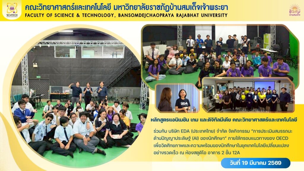 หลักสูตรแอนิเมชัน เกม และดิจิทัลมีเดีย คณะวิทยาศาสตร์และเทคโนโลยี ร่วมกับ บริษัท EDA (ประเทศไทย) จำกัด จัดกิจกรรม “การประเมินสมรรถนะด้านปัญญาประดิษฐ์ (AI) ของนักศึกษา” ภายใต้กรอบแนวทางของ OECD เพื่อวัดศักยภาพและความพร้อมของนักศึกษาในยุคเทคโนโลยีเปลี่ยนแปลงอย่างรวดเร็ว ณ ห้องสตูดิโอ อาคาร 2 ชั้น 12A
