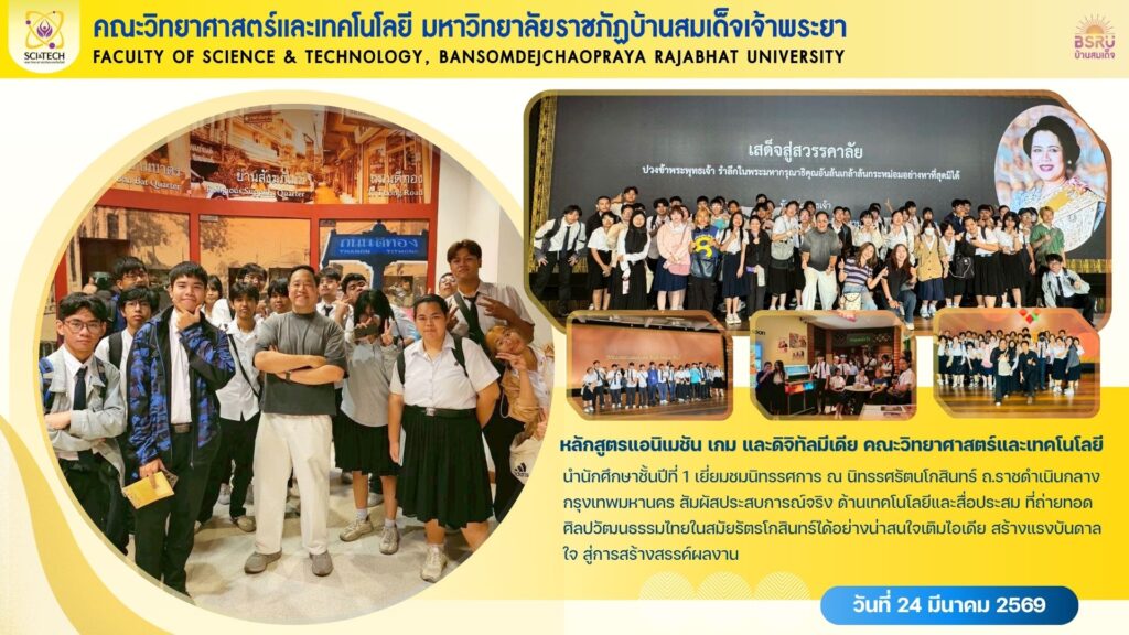 หลักสูตรแอนิเมชัน เกม และดิจิทัลมีเดีย คณะวิทยาศาสตร์และเทคโนโลยี จัดกิจกรรม นำนักศึกษาปี 1 เข้าเยี่ยมชมนิทรรศการ ณ นิทรรศน์รัตนโกสินทร์ ถนนราชดำเนิน กรุงเทพฯ เพื่อสัมผัสประสบการณ์จริงด้านเทคโนโลยีและสื่อประสมที่ถ่ายทอดศิลปวัฒนธรรมไทยในสมัยรัตนโกสินทร์ได้อย่างน่าสนใจเติมไอเดีย สร้างแรงบันดาลใจ สู่การสร้างสรรค์ผลงาน