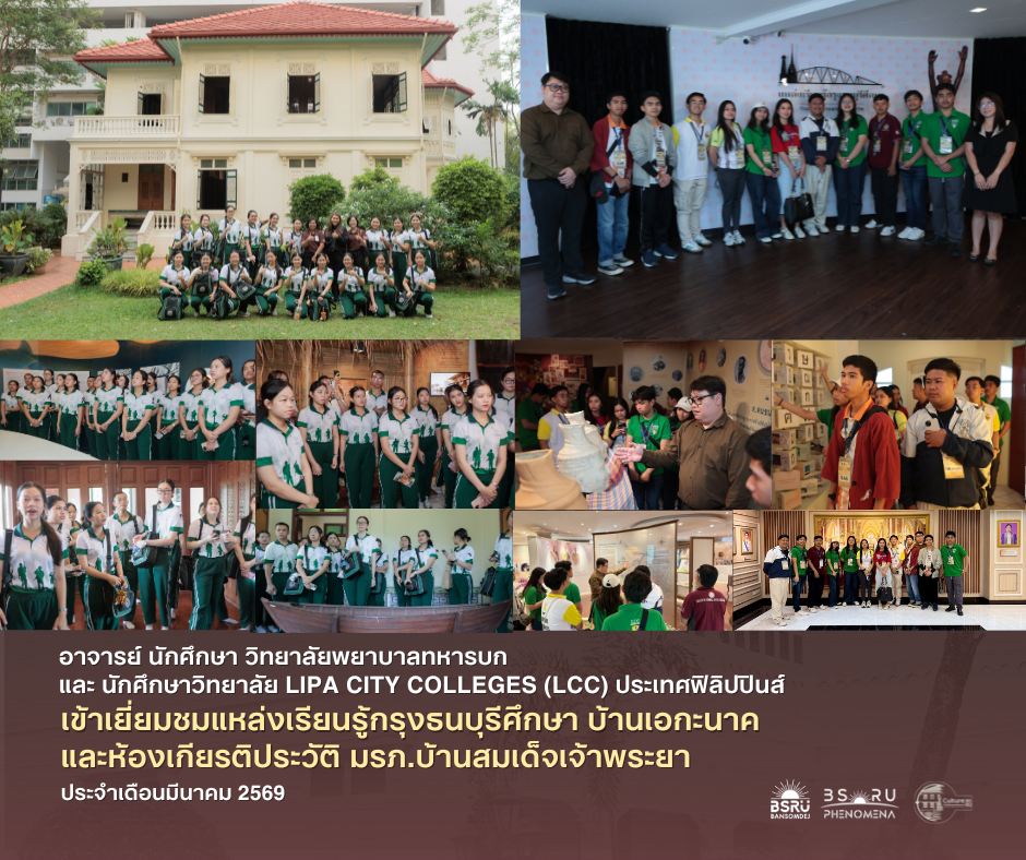 ประจำเดือนมีนาคม ๒๕๖๙ เมื่อวันพฤหัสบดีที่ ๑๒ มีนาคม ๒๕๖๙ ผู้ช่วยศาสตราจารย์สุเมธ พัดเอี่ยม ผู้อำนวยการสำนักศิลปะและวัฒนธรรม มอบหมายให้ อาจารย์ ดร.วรวรรณ ปิ่นรัตนากร รองผู้อำนวยการสำนักศิลปะและวัฒนธรรม ให้การต้อนรับและเป็นวิทยากรนำชมแหล่งเรียนรู้กรุงธนบุรีศึกษาและบ้านเอกะนาค แก่คณะอาจารย์ และนักศึกษาจากวิทยาลัยพยาบาลทหารบก ซึ่งมีจุดประสงค์เพื่อศึกษาประวัติความเป็นมาของชุมชนฝั่งธนบุรี นำไปวิเคราะห์ปัจจัยด้านโครงสร้างทางสังคม เชื้อชาติ ศาสนา การศึกษาที่มีผลต่อความเชื่อวิถีชีวิตกับการอยู่ร่วมกันในสังคมที่มีความหลากหลายทางวัฒนธรรมการประสานงานครั้งนี้ เป็นพลังความร่วมมือของมหาวิทยาลัยราชภัฏบ้านสมเด็จเจ้าพระยาและชุมชนวัดประดิษฐาราม เชื่อมต่อเส้นทางการท่องเที่ยว เชิงวัฒนธรรม ทั้งภายในมหาวิทยาลัย และพื้นที่ของชุมชน เพื่อสนับสนุนคณาจารย์และนักศึกษาวิทยาลัยพยาบาลทหารบก ในการศึกษาการจัดการของชุมชน เพื่อคงรักษาอัตลักษณ์ไว้ การหลอมรวมวัฒนธรรมเพื่อพัฒนาคุณภาพชีวิตที่ดี การอยู่ด้วยกันอย่างมีความสุข สามัคคี และการสร้างความมั่นคงทางสังคม และเมื่อวันพุธที่ ๒๕ มีนาคม ๒๕๖๙ สำนักวิเทศสัมพันธ์และเครือข่ายอาเซียน นำคณะนักศึกษาจากโครงการบริการวิชาการหลักสูตรระยะสั้นด้านภาษาและวัฒนธรรม “Overseas Education and Learning Programme” ระหว่างวิทยาลัย Lipa City Colleges (LCC) ประเทศฟิลิปปินส์ และมหาวิทยาลัยราชภัฏบ้านสมเด็จเจ้าพระยา (BSRU) เข้าเยี่ยมชมแหล่งเรียนรู้กรุงธนบุรีศึกษา และห้องเกียรติประวัติมหาวิทยาลัยราชภัฏบ้านสมเด็จเจ้าพระยา