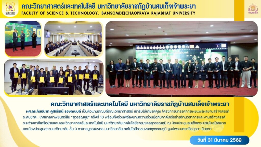 ผศ.ดร.กัมปนาท คูศิริรัตน์ รองคณบดี เป็นตัวแทนคณบดีคณะวิทยาศาสตร์และเทคโนโลยี เข้ารับโล่เกียรติคุณ โครงการนิทรรศการเผยแพร่ผลงานสร้างสรรค์ระดับชาติ : เทศกาลภาพยนตร์สั้น “สุวรรณภูมิ” ครั้งที่ 10 พร้อมทั้งร่วมพิธีลงนามความร่วมมือกับภาคีเครือข่ายด้านวิชาการและงานสร้างสรรค์ ระหว่างภาคีเครือข่ายและคณะวิทยาศาสตร์และเทคโนโลยี มหาวิทยาลัยเทคโนโลยีราชมงคลสุวรรณภูมิ ณ ห้องประชุมสมเด็จพระบรมไตรโลกนาถ เเละห้องประชุมสภามหาวิทยาลัย ชั้น 3 อาคารบูรณมงคล มหาวิทยาลัยเทคโนโลยีราชมงคลสุวรรณภูมิ ศูนย์พระนครศรีอยุธยา หันตรา
